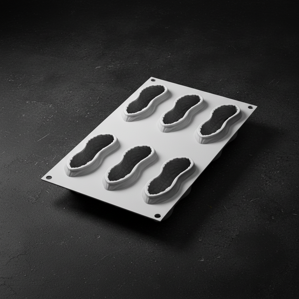 Questo stampo in silicone alimentare riproduce fedelmente la forma di un'arachide, perfetto per realizzare praline, cioccolatini, monoporzioni, gelati e dessert creativi che stupiscono per originalità e precisione.